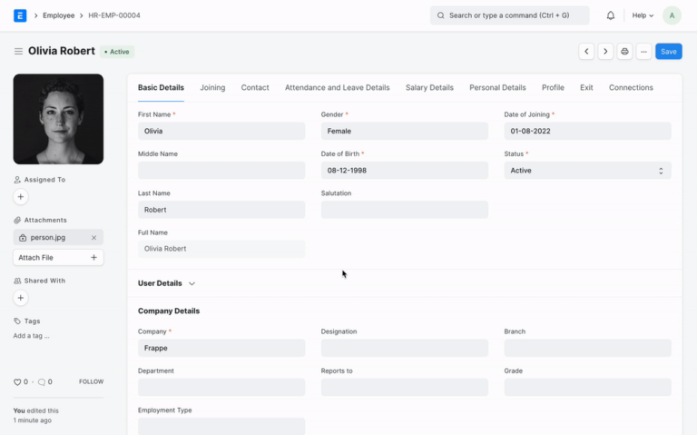 An employee in Frappe HRMS is defined as an individual who works part-time or full-time under an employment contract, with recognized rights and duties within your company. Frappe HRMS provides a robust Employee Master module that captures comprehensive employee information, from demographic details to professional history. As the central hub of HRMS Dubai, the Employee Master connects to every other HR module in the system.